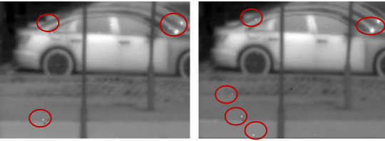 另外,盲元又稱無效像元,表現為個別像元對紅外輻射的響應率過高或過低,使得通過一系列光電轉換后呈現出的紅外圖像中,出現或明或暗的斑點(如下圖)。盲元受材料本身影響較大,在制冷型紅外探測器芯片中,InSb因材料本身的高均勻性,具有較好的盲元指標。