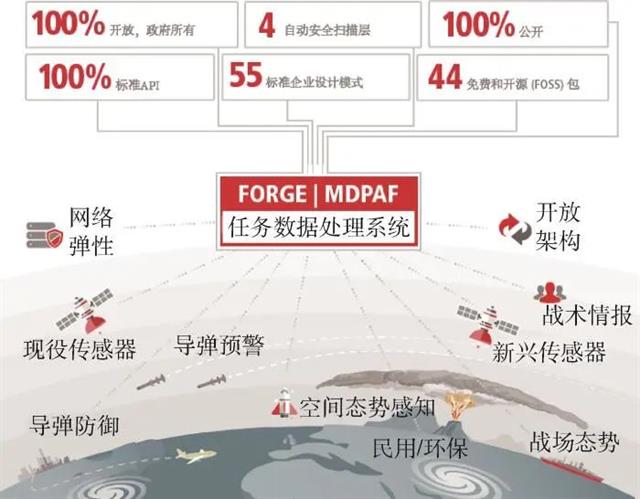 2020年1月28日,雷神公司獲得美國空軍為期5年的1.97億美元合同,用于設計OPIR地面數據處理系統,該項目被稱為“未來作戰彈性地面演進計劃”(future operationally resilient ground evolution,FORGE)[18],取代SBIRS地面數據處理系統,計劃在2024財年投入運營。FORGE本質上是一個開放的架構,具有可擴展、可伸縮以及靈活的特點,可基于該平臺開發特定的應用程序,其主要任務是向五角大樓和國家指揮機構發出導彈警告,也支持民用應用開發,如圖 4所示。