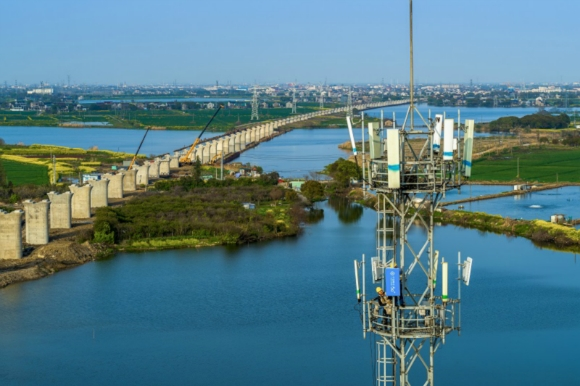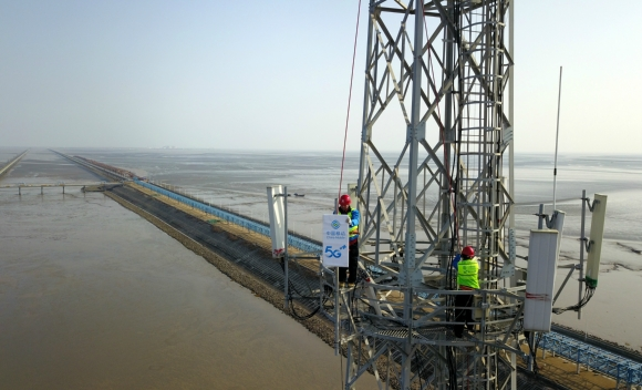 圖為在南通黃海大橋沿岸80米高塔上建設(shè)5G基站。江蘇移動(dòng)供圖