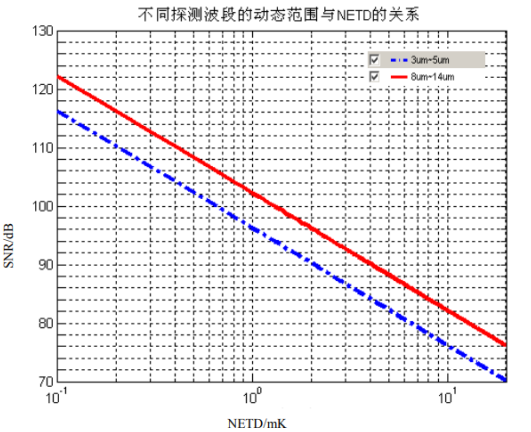 動態范圍和熱靈敏度(NETD)有著明顯的關系,假設紅外探測器量子效率為80%,在一定時間對于300K的探測目標,分別采用3~5um的中波波段和8~14um的長波波段對目標進行探測,探測器的動態范圍與NETD的關系如下圖所示,可以看出NETD值越小,動態范圍越大。未來,高靈敏度、大動態范圍的紅外讀出電路將更易被應用于背景光強變化較大、更復雜的場景。