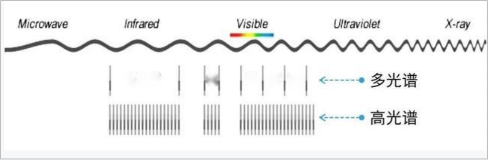 若將光譜想象成一條直線,光譜分辨率就是將波長分為多個波段,每個對應波段有著詳細的信息特征,形成一個通道。一般一個波段對應一個通道。光譜分析儀包括多光譜和高光譜兩類,多光譜分析儀的光學通道一般低于10個,而高光譜分析儀的光學通道一般成百上千個。下圖為多光譜和高光譜的通道對比示意圖: