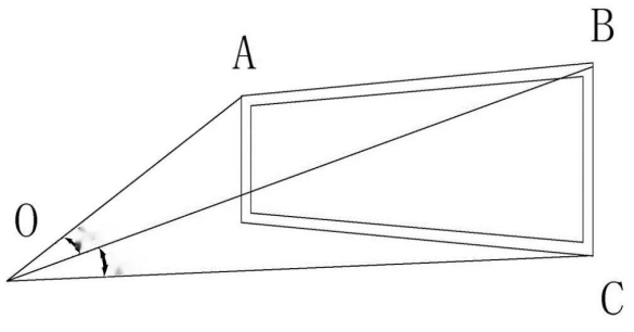 視場角是指光學鏡頭的視野范圍,由水平視場角和垂直視場角組成,如下圖角AOB為水平視角,角BOC為垂直視角。視場角越大,視野就越大;焦距變長,視場角變小;焦距變短,視場角變大。