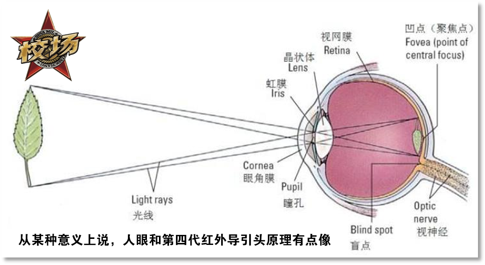 紅外導(dǎo)引頭,顧名思義是以目標發(fā)射出的紅外線作為信息來源,向?qū)椞峁┠繕朔轿坏闹茖?dǎo)機構(gòu)。用最通俗易懂的方式說,就像人眼可以通過物體反射的可見光進行成像一樣。但我們知道,人眼需要通過晶狀體聚焦,在視網(wǎng)膜上成像,再由視網(wǎng)膜上的視錐細胞把光信號轉(zhuǎn)化為神經(jīng)沖動傳遞給我們的大腦。導(dǎo)彈的紅外導(dǎo)引頭同理,也需要通過一系列復(fù)雜的手段把目標的紅外信號轉(zhuǎn)化為電信號。
