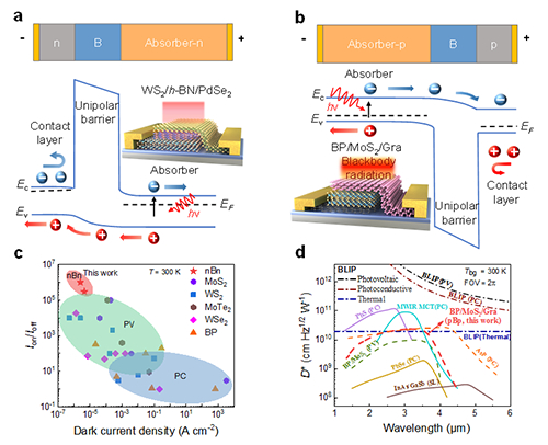 圍繞這一難題,胡偉達研究員與周鵬教授合作團隊獨辟蹊徑,利用二維原子層堆疊實現(xiàn)了能帶局域態(tài)有效調(diào)控,構(gòu)建的范德瓦爾斯單極勢壘探測器解決了傳統(tǒng)材料勢壘結(jié)構(gòu)外延生長晶格失配和組分能帶梯度難以控制的難題。他們一方面利用單極勢壘阻擋吸收層中的多數(shù)載流子運動控制器件耗盡區(qū)分布,阻止其向?qū)拵兜膭輭緦又修D(zhuǎn)移,有效降低了器件的SRH電流;另一方面,通過降低吸收層載流子濃度有效抑制了俄歇復(fù)合。此外,該單級勢壘結(jié)構(gòu)還具有類表面鈍化的隔離作用,從而降低了器件的表面漏電。室溫下(T=300K)的測試結(jié)果表明,制備出的范德瓦爾斯nBn單極勢壘探測器暗電流低至15 pA,pBp單極勢壘探測器在中波紅外波段的黑體探測率達到2.3×1010 cmHz1/2W-1(黑體探測率是國際標(biāo)準(zhǔn)化組織指定評價紅外探測性能的“國際標(biāo)準(zhǔn)”指標(biāo))(圖1)。