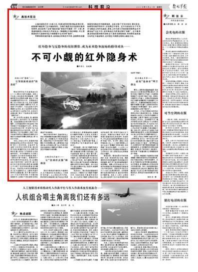 近年來,人們還不斷通過各類技術革新找尋紅外隱身的新方法。美國威斯康星大學研究人員研發的超薄紅外隱身薄板,主要用于確保士兵及其裝備在戰場上的安全。這種厚度不足1毫米的新型材料的主要成分為太陽能電池中常用的黑硅材料,約94%的紅外光都被黑硅吸收以實現隱身效果。研究人員還發現可在超薄紅外隱身薄板中置入電熱元件,進而發出可迷惑紅外探測器的虛假熱信號,讓坦克等武器裝備與公路上護欄的紅外光輻射相差無幾。