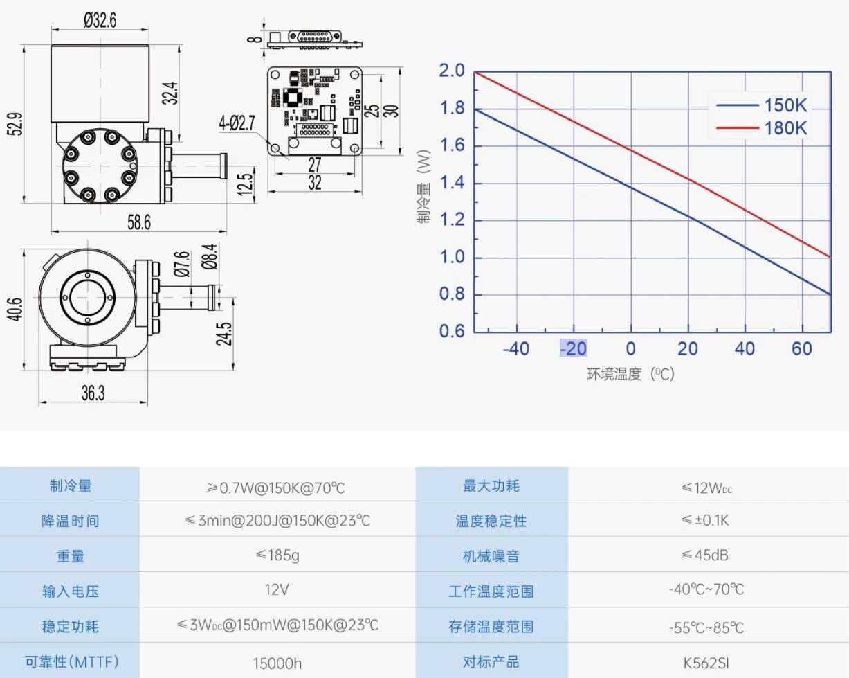 2.H108M微型輕量化整體式斯特林制冷機:是一款針對(HOT)組件設計的微型低功耗型斯特林制冷機,制冷溫區為130K-180K,按照集成式杜瓦/制冷組件(IDCA)概念設計。重量僅185g,冷指尺寸8mm,外形尺寸兼容以色列RICOR公司K562SI制冷機。150K制冷效率超過10%特別適合手持、穿戴設備和無人機平臺。