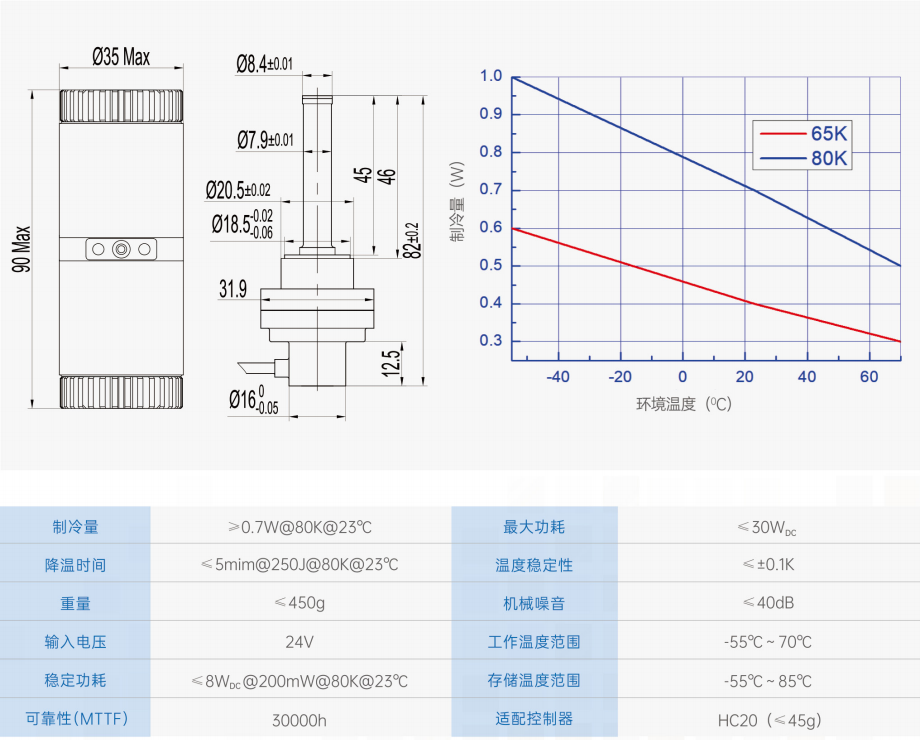 H158輕量化制冷機是一款輕量化線性分置式制冷機,按照集成式杜瓦/制冷組件(IDCA)概念設計。壽命長、輕量化、機械振動小和極低噪音,并具備降溫速度快和可靠性高等特點。已實現年批量500套的生產能力,可用于機載紅外吊艙、前視紅外系統、紅外制導系統、無人機等場合。