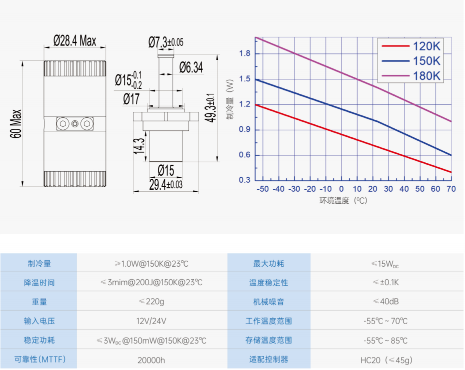 H126M微型低功耗制冷機是為適配高工作溫度探測器(HOT)組件開發的一款新產品,按照集成式杜瓦/制冷組件(IDCA)概念設計。非常小的體積和重量、極高的效率、極低的功耗,并具備降溫速度快和可靠性高等特點。產品已實現批量化生產,可用于手持熱像儀、無人機等場合。